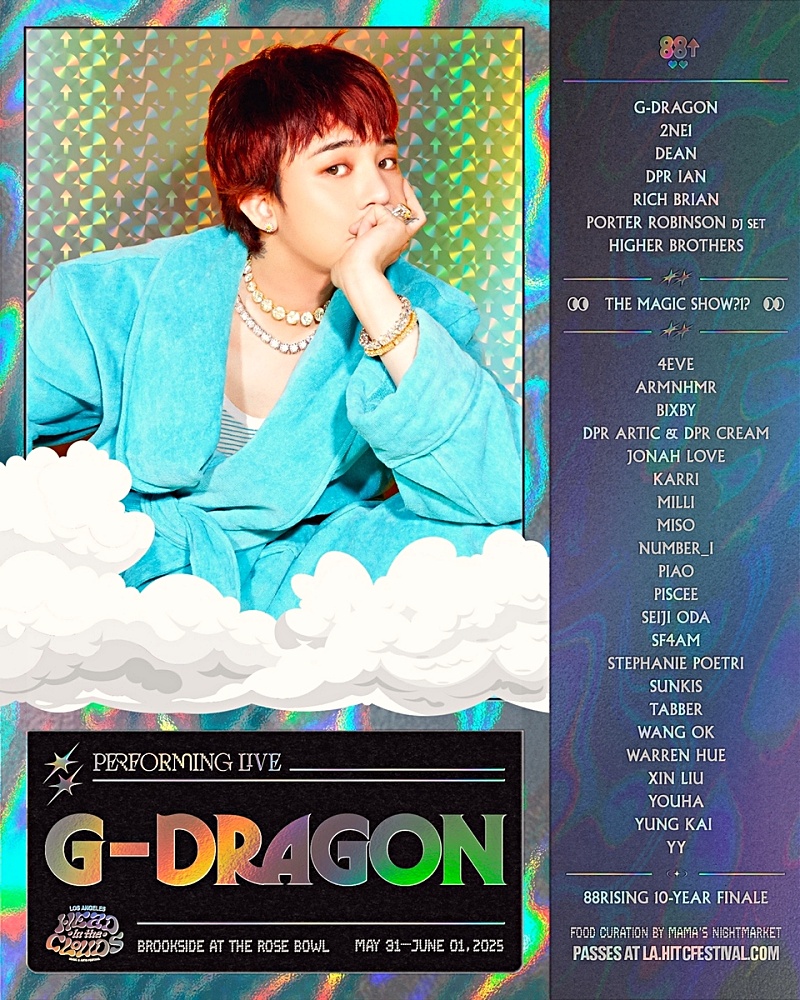 가수 지드래곤이 오는 5월 31일 캘리포니아에서 열리는 대형 음악 축제 ‘헤드 인 더 클라우드 로스앤젤레스 2025′(HEAD IN THE CLOUDS LOS ANGELES 2025)에 헤드라이너(간판출연자)로 나선다고 소속사 갤럭시코퍼레이션이 6일 밝혔다.