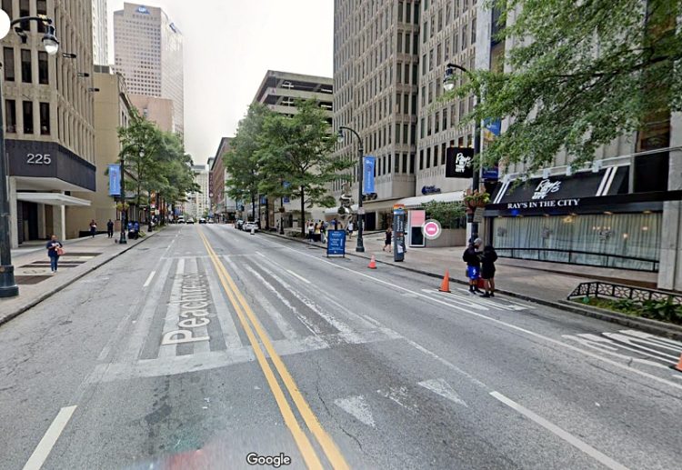 큰 빌딩들이 모여있는 애틀랜타 다운타운 피치트리 스트리트에서 최근 보행자가 길을 건너다 차에 치여 사망하는 사고가 발생, 도심 보행자 안전 문제가 대두되고 있다.