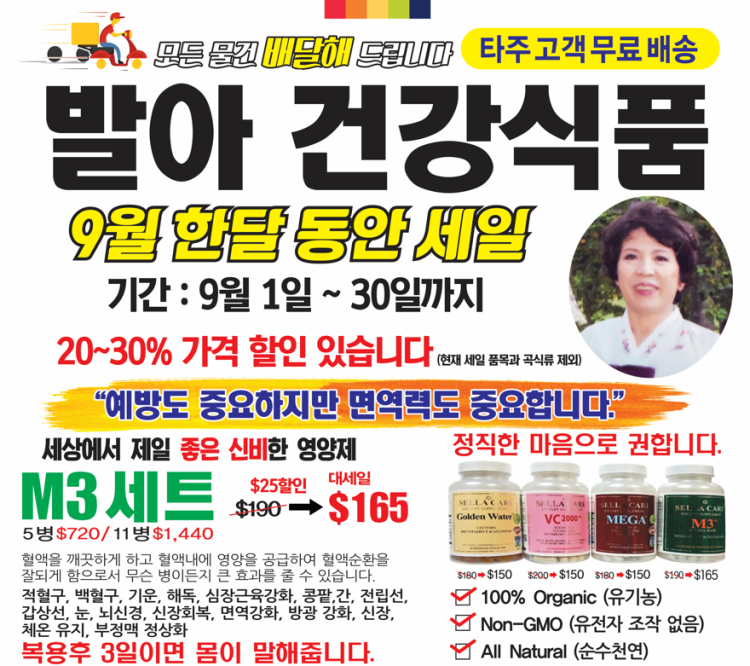 이 업소는 오는 30일까지 한달간 대표 영양제 ‘M3’세트를 정가 190달러에서 25달러 낮춘 165달러로 할인해 판매하는 등 추석 특별 세일을 진행한다. GMO 원료 없이 천연성분으로 이뤄진 M3는 혈액순환과 심장 근육 강화에 도움을 준다. 5병 구입시 720달러, 11병 구입시 1440달러다.