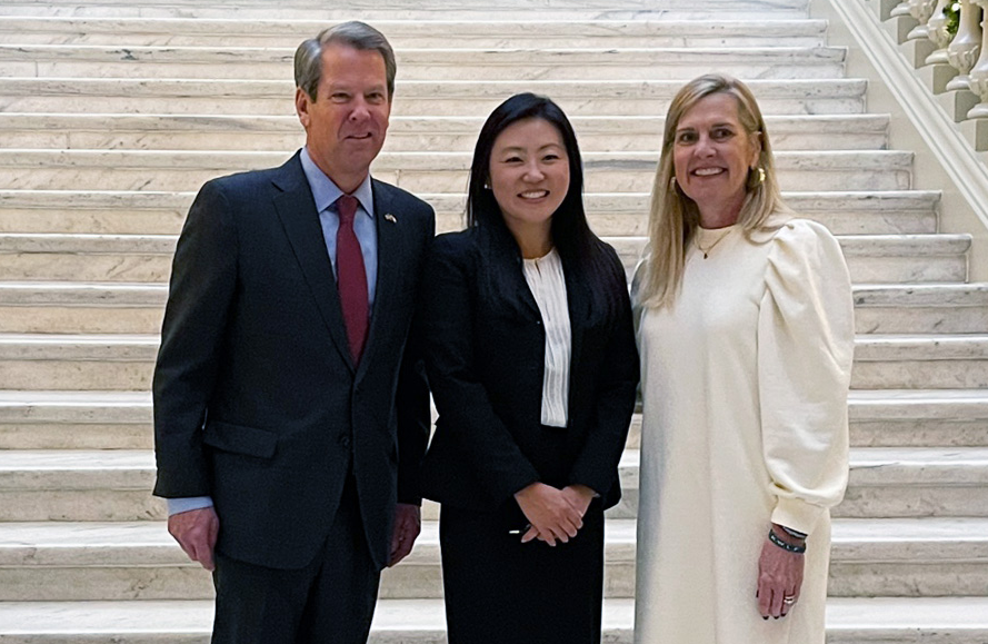 홍수정 조지아주 하원의원(가운데)이 브라이언 켐프 주지사, 마틴 켐프 주지사 부인과 함께 서 있다.