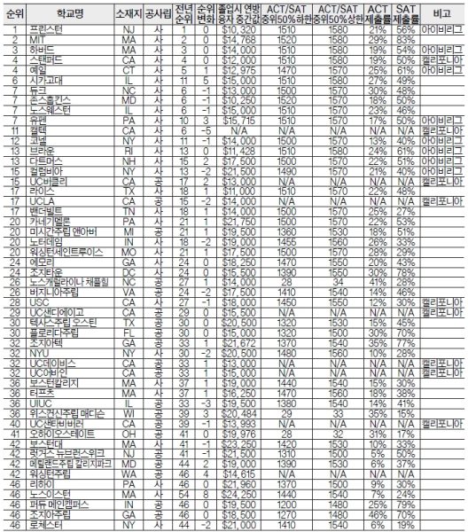 프린스턴대가 15년 연속으로 전국대학 순위1위의 자리를 차지했다. 또 MIT, 하버드, 스탠퍼드가 지난해와 같이 2~4위를 유지했다. 지난해 스탠퍼드와 공동 4였던 예일은 올해도 공동4위를 유지했다. 하지만 아이비리그 대학들이 상위권에서 유명세를 떨쳤다. HYP 이외의 나머지 5개 대학도 유펜(7위), 코넬(12), 브라운, 다트머스(공동13), 컬럼비아(15) 순으로 상위권에 자리했다.