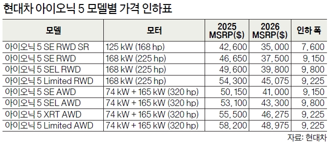 이번 가격 조정으로 아이오닉 5는 트림에 따라 최소 7600달러에서 최대 9800달러까지 낮아졌다. 〈표 참조〉