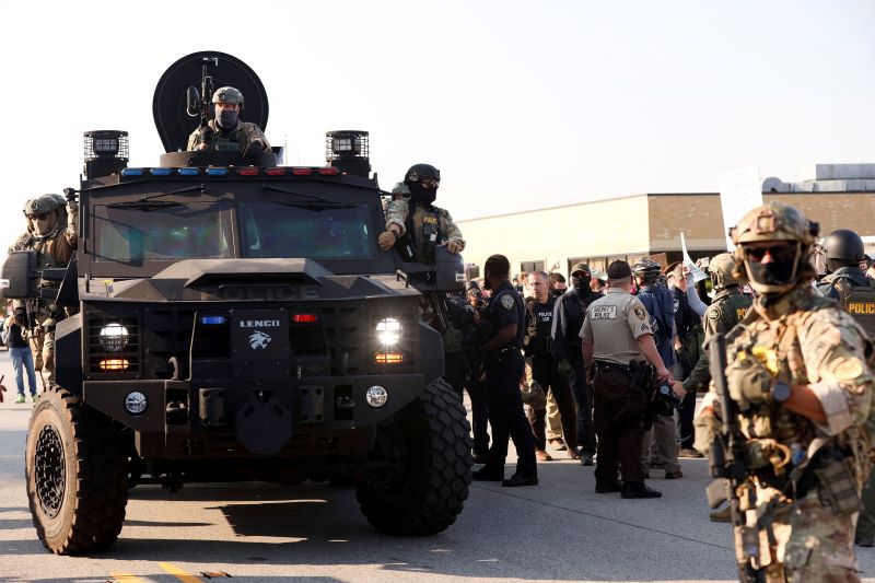 3일 시카고 이민세관단속국(ICE) 앞에서 경찰을 비롯, 무장한 법집행 인력이 시위대와 대치하고 있다. [로이터]