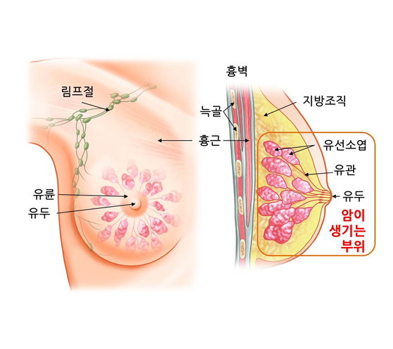 유방의 구조와 유방암 호발 부위. 사진 서울아산병원