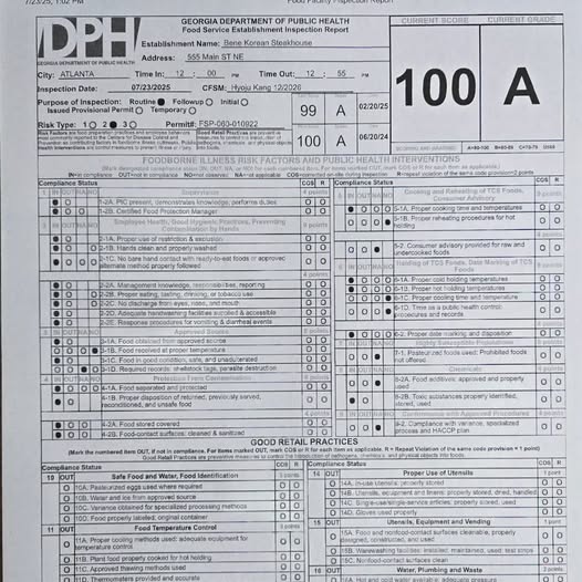 애틀랜타의 한식당인 베네 코리안 BBQ(사진)가 위생검사에서 100점 만점을 받으며 황금 주걱상을 받았다.