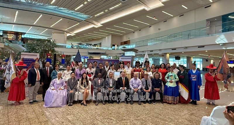 16일 기념행사 참석자들이 기념사진을 찍었다. 한인들뿐 아니라 공항 관계자들도 한복을 입고 참석했다.