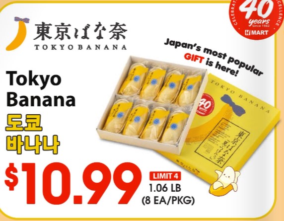 일본에서만 팔았던 대표 기념품 ‘도쿄 바나나’를 이제 H 마트에서도 구매할 수 있다. 23일까지 H 마트는 10.99달러에 도쿄 바나나(8개입)를 판매한다. 가까운 H 마트 지점에서 만나볼 수 있다.