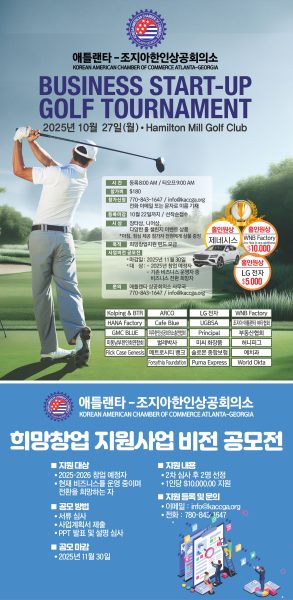 애틀랜타-조지아 한인상공회의소는 27일 월요일 오전 9시 해밀턴밀 골프클럽에서 지역사회의 창업과 비즈니스 성장을 지원하기 위한 ‘스타트업 골프대회’를 개최한다. 10월 22일까지 등록할 수 있다. 홀인원상으로 제네시스와 현금 5000달러가 준비돼 있다. 참가비는 180달러이고, 아침과 점심을 제공한다. 공모전을 통해 뽑힌 2명에게 각 1만 달러를 지원할 계획이다. 문의=770-843-1647