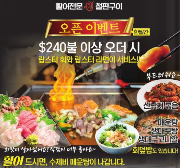 뷰포드에 새로 문을 연 활어 및 철판구이 전문 쇼군(3420 Buford Dr, #E)이 오픈 이벤트로 한 달간 240달러 이상 오더 시 랍스터 회와 랍스터 라면을 서비스로 제공한다. 또 활어를 시키면 수제비 매운탕을 증정한다. 이외에도 ‘부드러운’ 산낚지 볶음, 매운탕, 생대구탕, 회덮밥, 활도다리, 해삼 등의 메뉴가 마련돼 있다. 단체 손님도 환영한다. 문의=770-580-5188