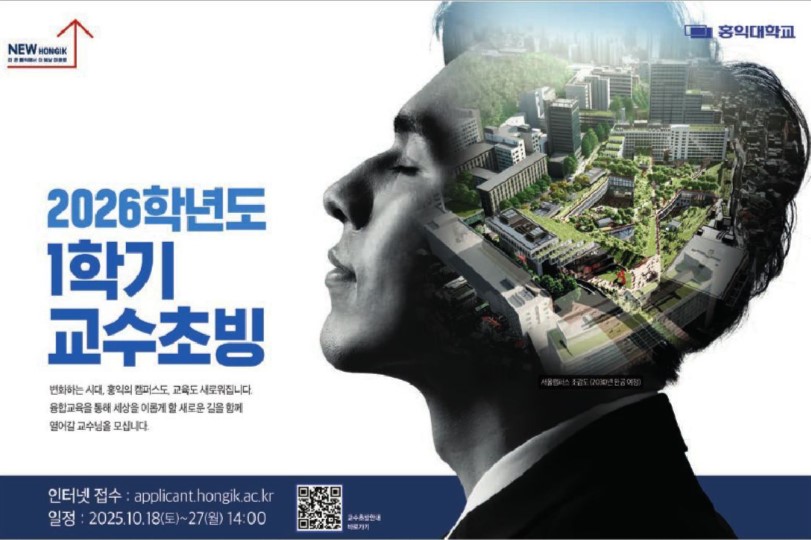 한국 홍익대학교가 2026학년도 1학기 교수를 초빙한다. 인터넷(applicant.hongik.ac.kr)으로 오는 27일 오후 2시(한국시간)까지 접수할 수 있다. 여러 분야의 전임교원을 초빙하고 있다.