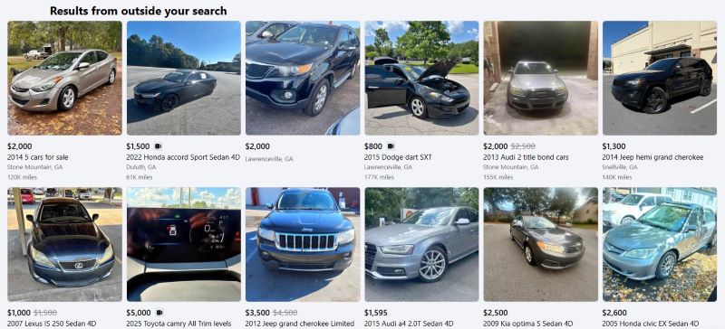 페이스북 마켓플레이스에 중고차를 검색하면 나오는 결과 페이지. 기사 내용과 관련 없음.