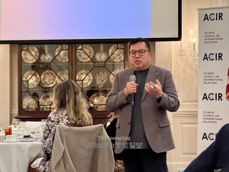 전인범 군사안보 전문가가 23일 애틀랜타에서 한미동맹을 주제로 강연하고 있다. 윤지아 기자.