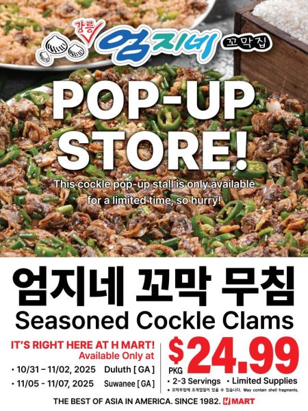 H 마트는 둘루스와 스와니에서 ‘강릉 엄지네 꼬막 팝업 스토어’를 연다. 둘루스점에서는 오는 31일부터 11월 2일까지, 스와니점에서는 내달 5~7일 진행된다. 팝업스토어에서 한국의 대표 포장마차 메뉴 중 하나인 ‘꼬막무침’을 한정 수량으로 판매할 예정이다.