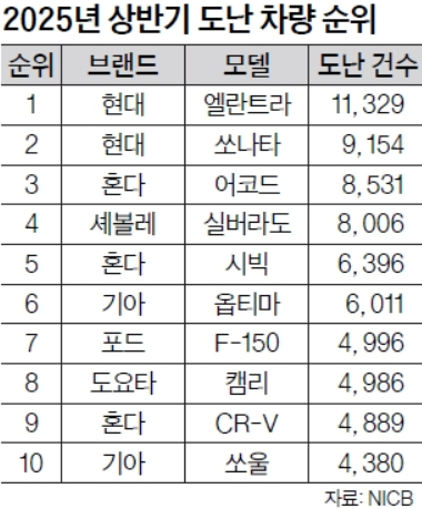 비영리 단체인 전국보험범죄국(NICB)이 발표한 최신 통계에 따르면, 지난 상반기 현대 엘란트라의 절도 건수는 총 1만1329건으로 전국에서 가장 많았다. 전체 차량 절도의 약 3.4%를 차지했다. 〈표 참조〉
