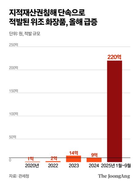 6일 중앙일보가 정보공개청구를 통해 관세청으로부터 확보한 자료에 따르면, 관세청이 올해 1~9월까지 적발한 국내 뷰티 브랜드 지식재산권 침해 피해 규모는 총 220억원으로 지난해(9억원) 대비 24배 이상 급증했다. 한국 뷰티 브랜드 제품인 것처럼 위조한 가품들이다. 2020년만 해도 1억원 수준이었는데 폭발적으로 늘어난 것이다.