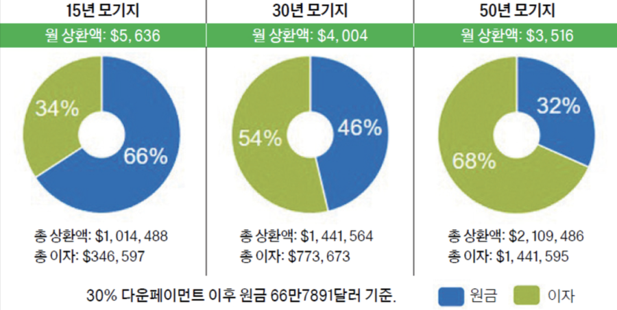 가장 일반적인 30년 만기 대출에서는 동일한 이자율 기준 이자가 77만3673달러, 총 상환액은 144만1564달러로 이미 원금보다 이자가 많다.