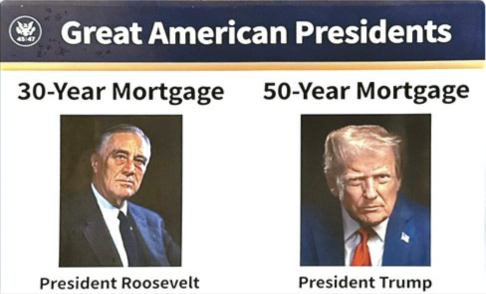 트럼프는 최근 자신의 소셜미디어(SNS)인 트루스소셜에 이미지 한 장 올라왔다. 프랭클린 루스벨트 대통령 사진과 함께 “30년 모기지”, 그 옆에는 자신의 사진과 “50년 모기지”라고 써있는 이미지를 올리면서 새로운 부동산 정책 추진을 암시했다.
