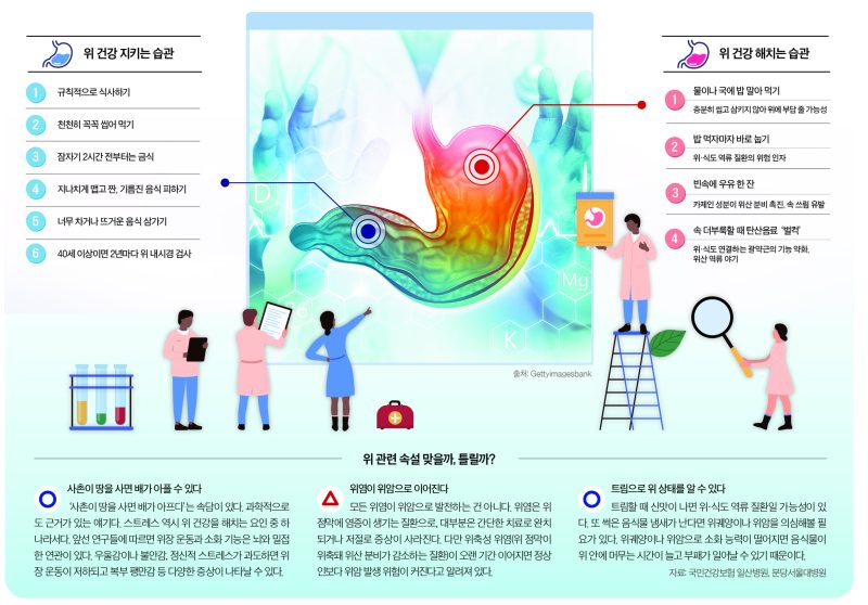위는 입에서 식도를 거쳐 내려간 음식물을 소화시키는 첫 번째 기관이다. 위가 제 기능을 잃으면 원활한 소화 과정에 악영향을 줄 수 있다. 이를 막으려면 규칙적인 식사 리듬을 유지하는 것이 중요하다. 정해진 시간에 과하지 않게 먹는 일, 단순하지만 놓치기 쉬운 기본 원칙이다. 불규칙한 식사나 폭식은 위 점막을 자극해 소화 기능을 떨어뜨릴 수 있다.