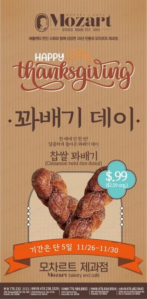 20년 전통의 모차르트 제과점이 30일까지 꽈배기 데이를 맞아 찹쌀 꽈배기를 99센트(정가 2.59달러)에 판매한다. 꽈배기데이는 꽈배기를 먹으면서 예전에 꼬인 일들을 풀어보는 날을 뜻한다. 모차르트는 둘루스 본점 외에도 뷰포드, 도라빌, 아씨마켓, 스와니점이 있다.