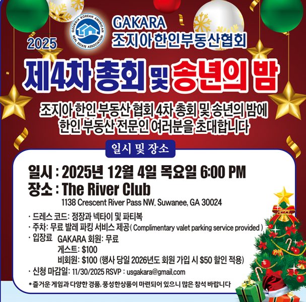 조지아한인부동산협회(GAKARA)는 내달 4일 스와니 ‘더 리버 클럽’에서 한인 부동산 전문인을 모아 제4차 총회 및 송년의 밤을 연다. 정장과 넥타이, 파티복을 입고 참석할 수 있다. 협회원은 무료 참석이 가능하며 비회원과 게스트는 100달러의 입장료를 내야 한다. 30일까지 참석 신청 가능하다. 문의=usgakara@gmail.com
