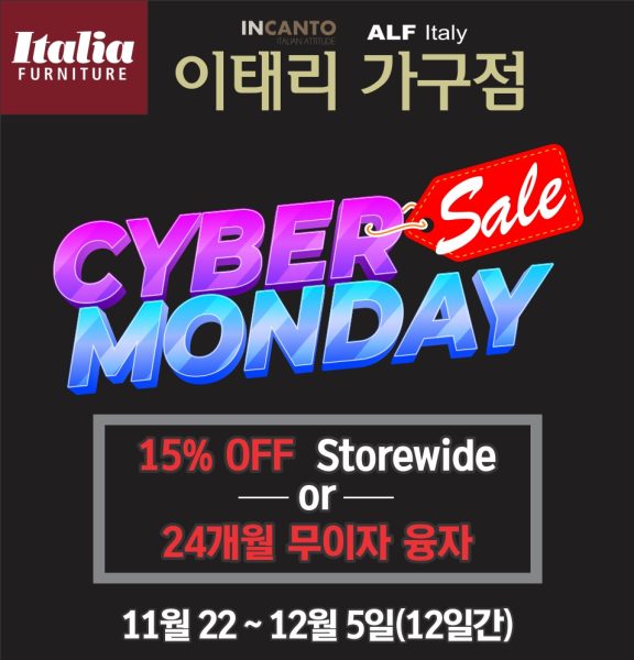 애틀랜타 최대 나뚜찌 공인 딜러 이태리가구점(6248 Dawson Blvd)이 사이버먼데이를 맞아 22일부터 내달 5일까지 12일간 15% 할인 또는 24개월 무이자 융자를 제공한다. 최신 신제품과 다양한 모델을 할인가격에 구입할 수 있다. 문의=770-416-1356