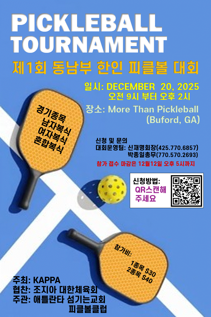조지아대한체육회와 애틀랜타 섬기는교회 피클볼 클럽이 함께 여는 제1회 동남부 한인 피클볼 대회가 내달 20일 오전9시부터 뷰포드 ‘모어 댄 피클볼’에서 열린다. 경기 종목은 남자복식, 여자복식, 혼합복식 3가지로, 1종목 참가시 30달러, 2종목 참가시 40달러의 비용을 내면 된다. 내달 12일까지 참가 접수를 받고 있다. 신청 및 문의=신재명 대회 운영팀 회장(425-770-6857), 박종일 총무(770-570-2693)