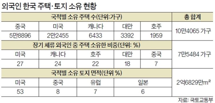 지난달 28일 한국 국토교통부가 발표한 ‘외국인 토지·주택 보유통계’에 따르면 올해 6월 말 기준 외국인이 소유한 한국 내 토지면적(2억6829만9000㎡)의 53.3%를 한인 등 시민권자가 보유, 미국 국적 토지 소유자가 다른 나라보다 압도적으로 많은 것으로 나타났다. 이어 중국(8.0%), 유럽(7.1%), 일본(6.1%) 순이었다. 외국인 보유 토지는 전체 국토면적의 0.27% 수준이다. 〈표 참조〉