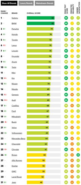 포르셰가 79점으로 3위였으며, 혼다(76점), 도요타(75점), 렉서스(75점) 등 일본 브랜드가 상위권을 채웠다. 혼다와 도요타는 직전 평가보다 각각 1계단, 4계단 상승했고, 렉서스는 3계단 떨어졌지만 여전히 상위권을 유지했다.