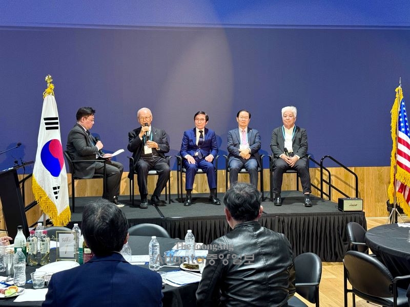 2부 송년회에서 선배 멘토들과 차세대들의 대화가 진행됐다. 위에는 오유제, 남기만, 박형권, 박남권 명예회장이 자신의 성공 및 경험담을 공유하는 모습. 아래는 옥타 차세대들의 고민과 커리어를 선배 멘토들과 참석자들이 경청하는 모습.