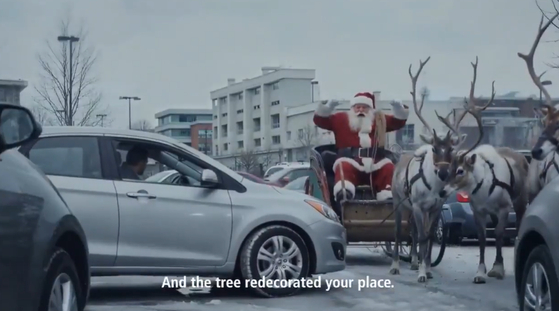 광고 영상에는 성가대가 거센 눈보라를 맞으며 노래를 부르고 쇼핑몰을 찾은 고객들이 할인 행사 중인 곰 인형을 두고 다투는 모습이 그러졌다. 또 썰매를 타고 가던 산타클로스가 교통체증에 갇혀 짜증을 내고 고양이가 크리스마스 트리를 망가뜨리는 등의 상황이 이어졌다.