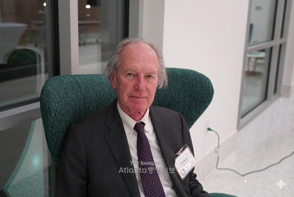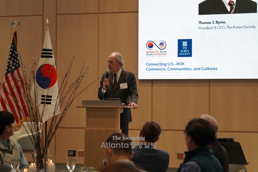 한미 우호 증진을 위한 미국 비영리단체 코리아소사이어티의 토마스 번 회장을 11일 열린 한미동남부상공회의소(SEUSKCC) 연례 만찬장에서 만났다. 상의는 올해 행사를 조지아주 현대차그룹 메타플랜트(HMGMA)에서 열었다. 지난 9월 한국인 구금사태가 발생했던 이곳에서 기업인과 정치인을 한 데 모아 한미간 신뢰 구축과 교류 협력 중요성을 다시금 확인하자는 의미다.