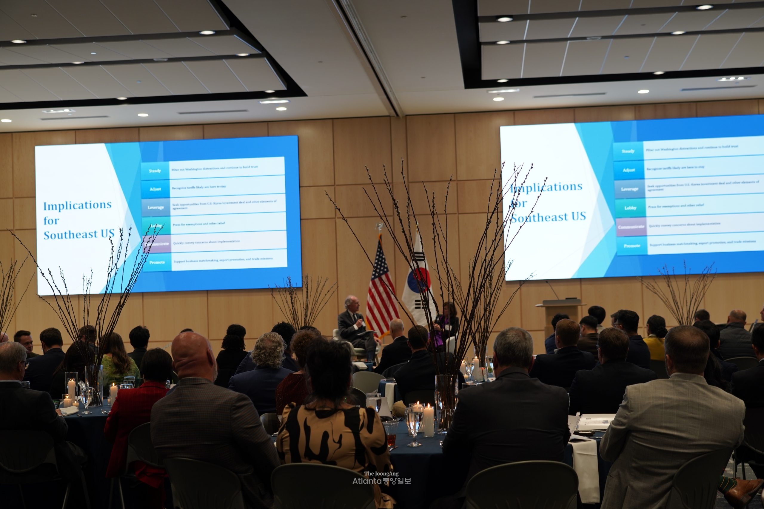 11일 한미동남부상공회의소(SEUSKCC)는 조지아주 현대차그룹 메타플랜트(HMGMA)에서 현대차·기아·풍산그룹·이화산업 등 주요 기업과 지방정부 관계자, 한미동맹 연구자들을 초청, 연례 만찬을 열었다. 동남부지역 한국 기업환경 개선 및 한미 동맹 강화를 위해 매년 12~1월 사이 열리는 이 행사는 SEUSKCC의 가장 큰 행사로 그해 주요 경제 이슈가 논의된다. 트럼프 재집권으로 대외 불확실성이 급격히 커진 올해는 토마스 번 코리아소사이어티 회장, 바바라 와이젤 전 미국무역대표(USTR) 차관보 등이 참석한 가운데 고관세, 미중갈등, 경제안보, 비자 문제가 복합적으로 다뤄졌다.