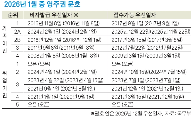2026년 새해를 맞이하는 첫 영주권 문호에서는 가족이민과 취업이민 문호가 소폭 전진했다. 다만 가족이민 문호의 경우, 비자발급 우선일자는 한 발짝도 나아가지 못한 채 접수가능일자만 소폭 진전하는 모습이었다. 가족이민 영주권 문호는 2025년 12월 문호에서도 비자발급 우선일자는 전면 동결된 바 있다.