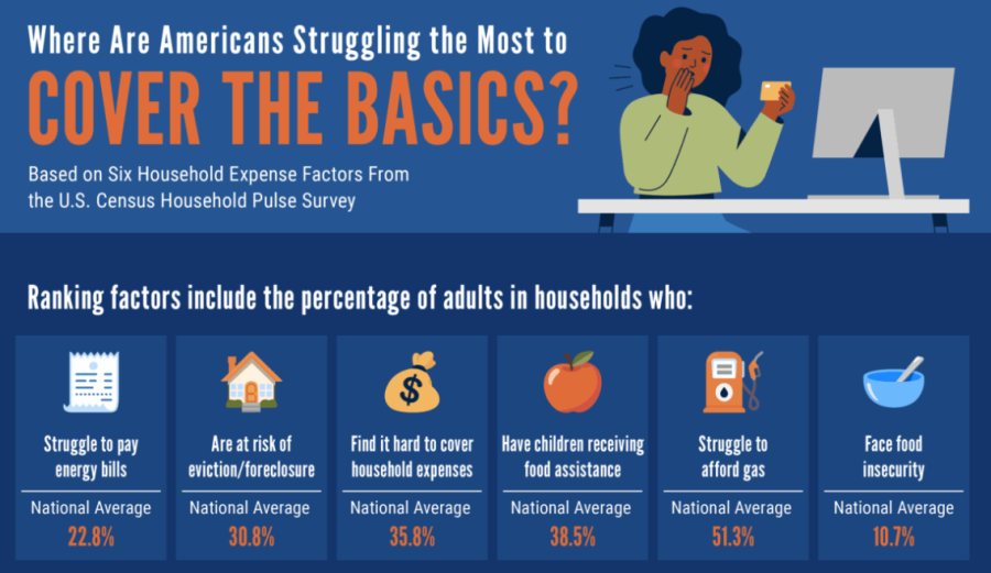 생필품 가격에 가장 큰 부담을 느끼는 주는 미시시피인 것으로 집계됐다. 모기지를 감당하지 못해 퇴거 또는 주택 압류에 직면한 가구가 37%가 넘고, 공과금(에너지 요금)을 내지 못하는 가구가 30%, 식량 불안정을 겪는 가구가 약 15%에 달했다. 2위는 루이지애나로, 가계 지출을 버거워하는 가구가 약 43%나 됐다. 웨스트버지니아, 뉴멕시코, 네바다, 오클라호마, 캘리포니아 등이 뒤를 이었다. 캘리포니아는 주유비 감당이 어려운 가구가 약 59%, 식량 복지를 받는 아동이 57%가 넘었다.
