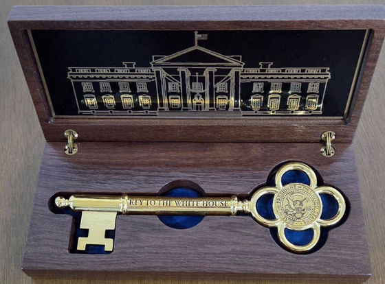 백악관 황금열쇠는 트럼프 대통령이 특별한 손님에게 주기 위해 직접 디자인한 것으로, 대통령 문장과 함께 ‘KEY TO THE WHITE HOUSE’라는 문구가 각인돼 있다. 지금까지 베냐민 네타냐후 이스라엘 총리, 아소 다로 전 일본 총리, 일론 머스크 테슬라 최고경영자(CEO), 축구선수 크리스티아누 호날두 등이 이 황금열쇠를 받은 것으로 알려졌다.