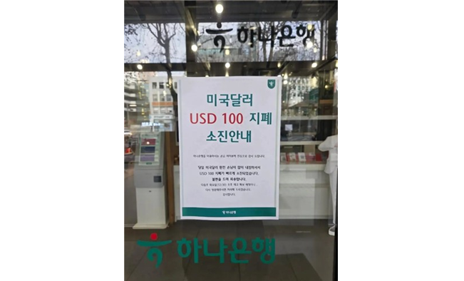 24일 금융권에 따르면 서울 강남 지역 하나은행 지점 한 곳은 이날 미화 100달러 지폐가 소진됐다는 안내문을 게시했다.