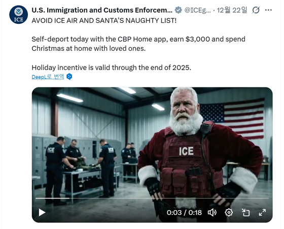 ICE는 지난 22일 소셜미디어 엑스(Xㆍ옛 트위터)에 “ICE 항공편과 산타의 ‘나쁜 아이 명단’을 피하라”는 문구와 함께 18초 분량의 영상을 게시했다. 영상에는 붉은색 방탄조끼에 털모자를 쓴 산타클로스 복장의 ICE 요원이 길거리에서 불법 체류자에 수갑을 채워 체포하고 신원 확인 절차를 거쳐 ‘ICE 항공(AIR)’이라고 적힌 비행기에 태워 본국으로 추방하는 장면이 담겼다.