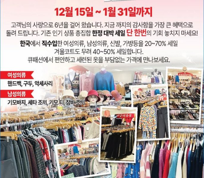 둘루스 메가마트(2100 Pleasant Hill Rd) 2층 Q패션은 1월 31일까지 6주년 감사 기획 특별 세일을 진행한다. 한국에서 직수입한 여성·남성의류, 신발, 가방 등을 20~70% 할인하고, 겨울코트도 40~50% 할인한다. 문의=213-410-6788