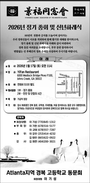 애틀랜타 지역 경복고등학교 동문회(회장대행 이기성)는 내달 17일 오전 11시 이판 레스토랑에서 2026년 정기 총회 및 신년하례식을 개최한다. 1부 정기총회 2부 만찬 순서로 진행될 예정이다. 문의=이기성 회장대행 770-845-1312, 이기헌 부회장 678-516-5177