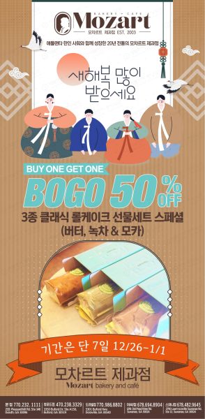 20년 전통의 모차르트 제과점이 버터, 녹차, 모카 3종 클래식 롤케이크 선물세트 스페셜을 1+1 할인한다. 세일 기간은 26일부터 내달 1일까지 7일이다.