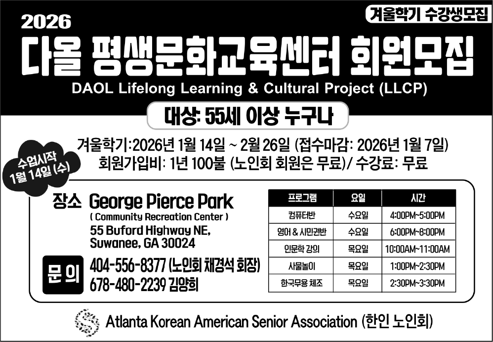 애틀랜타 한인 노인회(회장 채경석)는 내달 14일부터 영어 교육 및 시민권 취득을 위한 평생교육센터 겨울학기를 시작한다. 조지 피어스 공원에서 매주 수요일 오후 6시부터 2시간 동안 진행된다. 이외 컴퓨터반, 인문학, 사물놀이, 한국무용 등도 들을 수 있다. 문의=404-556-8377, 678-480-2239