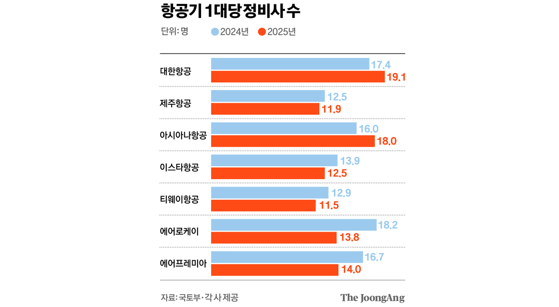 대한항공의 항공기 1대당 항공정비사는 지난해 말 17.4명에서 이달 19.1명으로 늘었다. 아시아나도 16명에서 18명으로 증가했다. 반면 ▶에어로케이 18.2→ 13.8명 ▶에어프레미아 16.7→ 14명 ▶이스타항공 13.9→ 12.5명 ▶티웨이항공 12.9→ 11.5명 등 LCC군에 있는 다수의 항공사에선 모두 감소했다. 지난해 사고가 발생했던 제주항공도 12.5명에서 11.9명으로 감소했다.