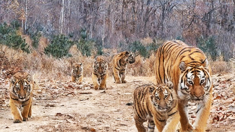 중국 북동부 국립공원에서 야생 백두산 호랑이 어미 1마리와 새끼 5마리가 함께 이동하는 장면이 관찰 카메라에 포착됐다. 중국에서 호랑이 6마리로 이뤄진 가족이 한 화면에 담긴 것은 이번이 처음이다.