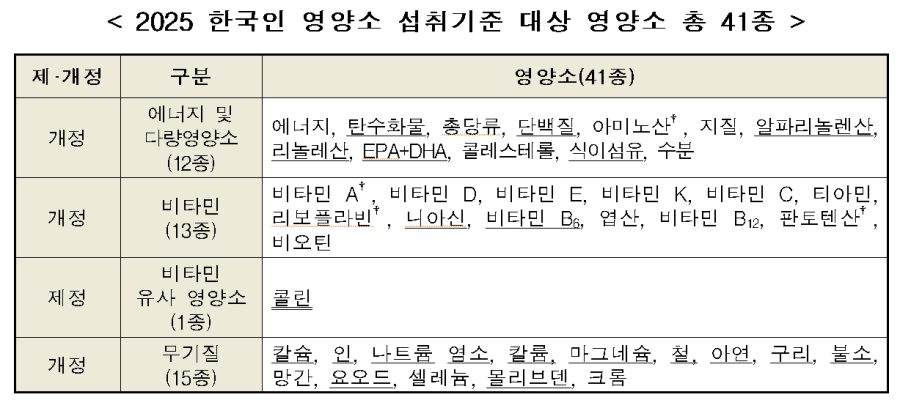 2025 한국인 영양소 섭취 기준 대상 영양소 41종. 자료 보건복지부