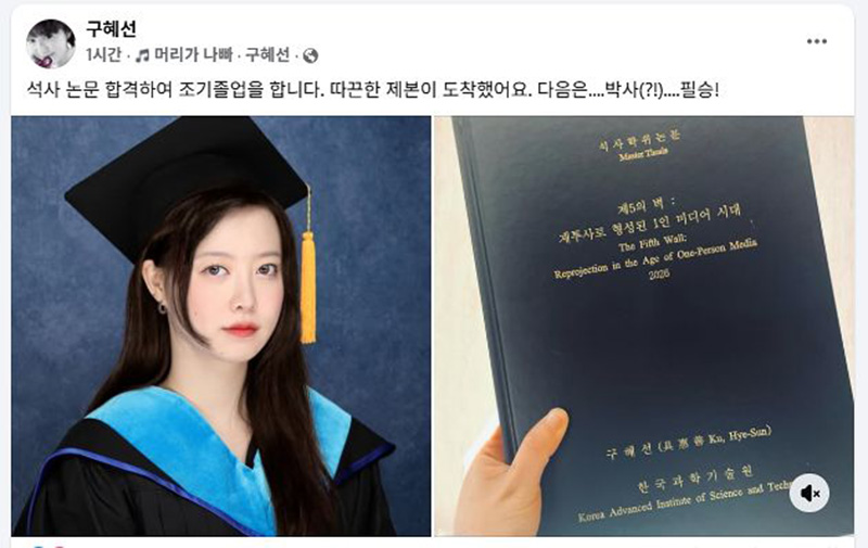 학위복과 학사모를 착용한 모습과 석사학위 논문 제본 표지 사진도 첨부했다. 논문 제목은 ‘제5의 벽: 재투사로 형성된 1인 미디어 시대’이다.