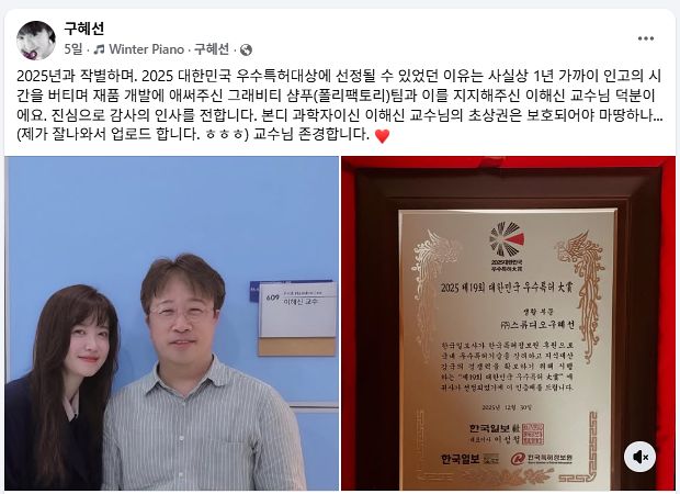 구혜선은 이후 지난 3일에는 페이스북에 “2025년과 작별하며 2025 대한민국 우수특허대상에 선정될 수 있었던 이유는 사실상 1년 가까이 인고의 시간을 버티며 제품 개발에 애써주신 그래비티 샴푸(폴리팩토리)팀과 이를 지지해주신 이해신 교수님 덕분“이라며 감사의 인사를 남겼다. ‘쿠롤’은 지난달 론칭됐다.
