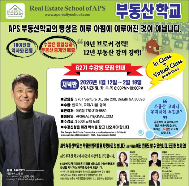 10여년 동안 수많은 부동산 중개인을 배출해낸 APS 부동산학교가 62기 수강생을 모집한다. 저녁반은 오는 12일부터 내달 9일까지 월, 화, 수, 목 오후 6시부터 10시까지 진행된다. 수강신청을 미리 약속을 잡고 나와야 한다. 문의=770-310-9589(이경철 강사)