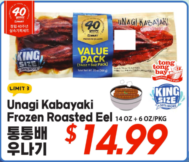 H 마트에서 오는 15일까지 통통배 냉동 우나기를 14.99달러에 판매한다. 이외에도 홍치 아이스크림 3+1을 9.99달러에 할인한다. 가까운 H 마트 지점에서 만나볼 수 있다.