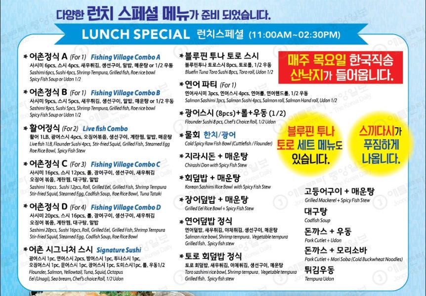 둘루스 종스보석 옆 어촌일식(3751 Satellite Blvd. #400)이 새 매니지먼트로 바뀌며 다양한 메뉴를 런치 스페셜로 제공한다. 사시미와 스시, 튀김, 생선구이, 매운탕 등이 포함된 어촌정식부터 회덮밥, 물회, 장어덮밥까지 여러 가지가 준비돼 있다. 블루핀 투나 토로 세트 메뉴도 있으며, 매주 목요일 한국직송 산낙지가 들어온다. 월요일은 쉰다. 문의=470-395-8848