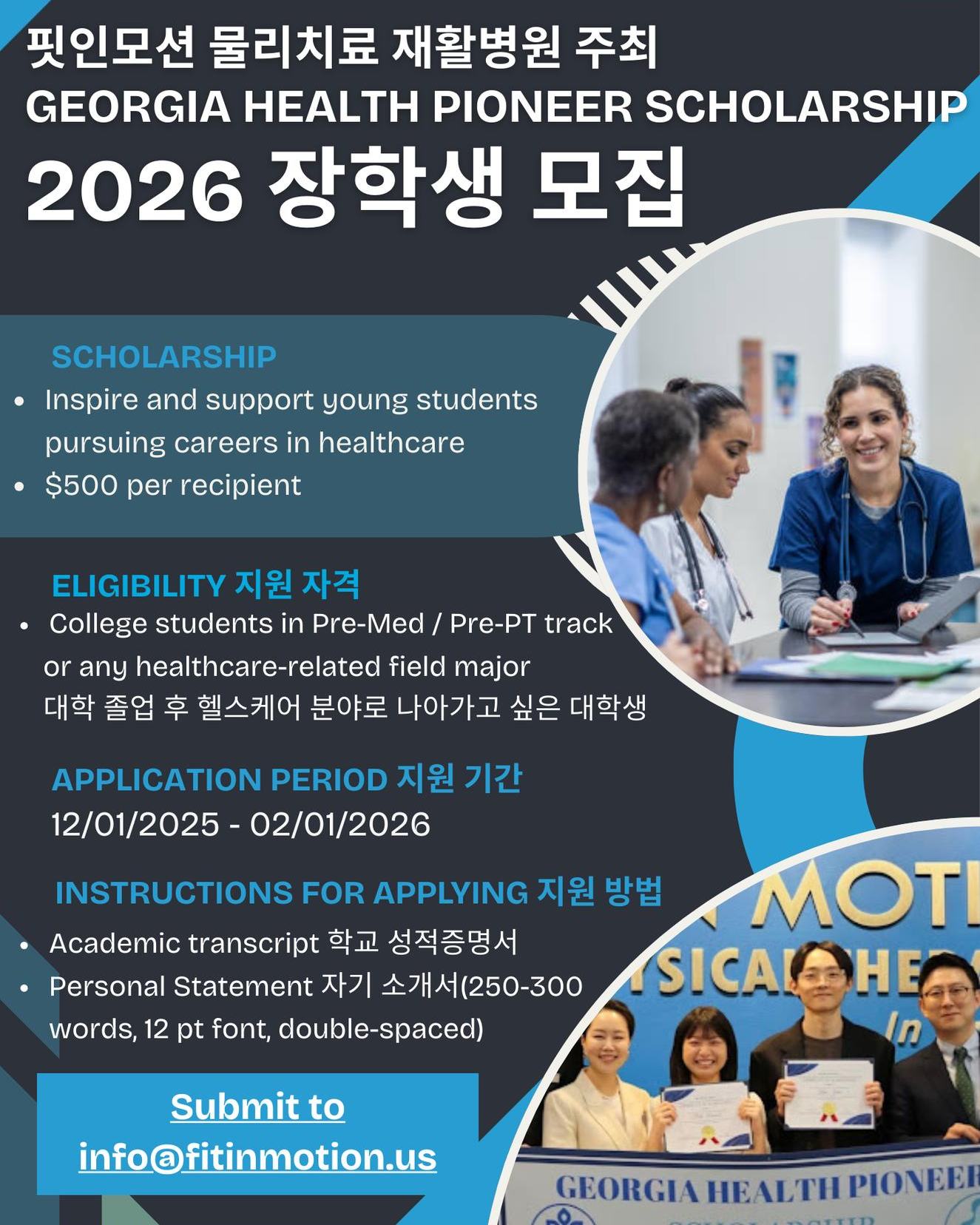 조지아주 최대 한인 물리치료·운동재활센터 핏인모션이 프리메드(의대 입학 예비 과정) 등 헬스케어 분야 전공 장학생을 모집한다.